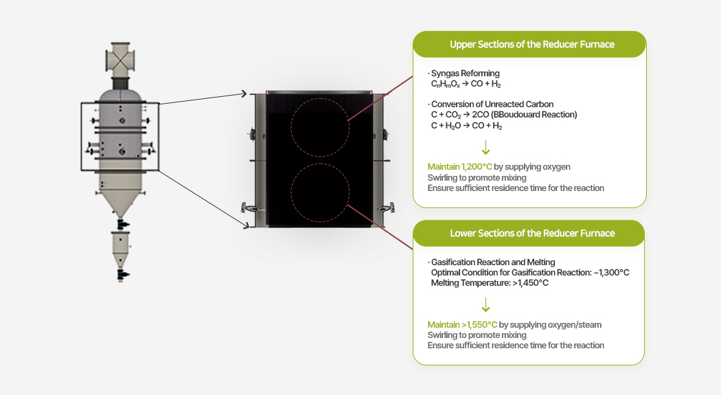 | Maximizing synthetic gas conversion efficiency | - Two-stage reduction furnace (1st stage: gasification/melting, 2nd stage: conversion of unreacted carbon) → Maximized efficiency - Swirl flow → Promotes mixing and secures residence time for unreacted carbon |