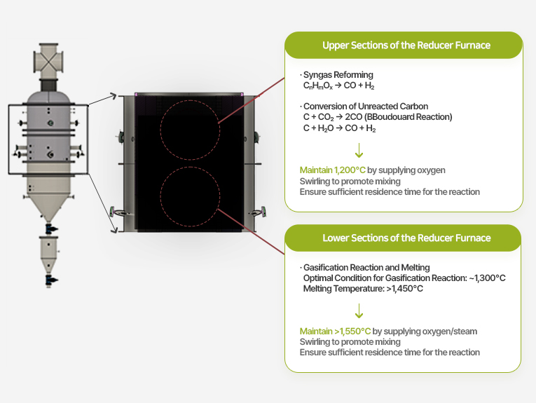 | Maximizing synthetic gas conversion efficiency | - Two-stage reduction furnace (1st stage: gasification/melting, 2nd stage: conversion of unreacted carbon) → Maximized efficiency - Swirl flow → Promotes mixing and secures residence time for unreacted carbon |